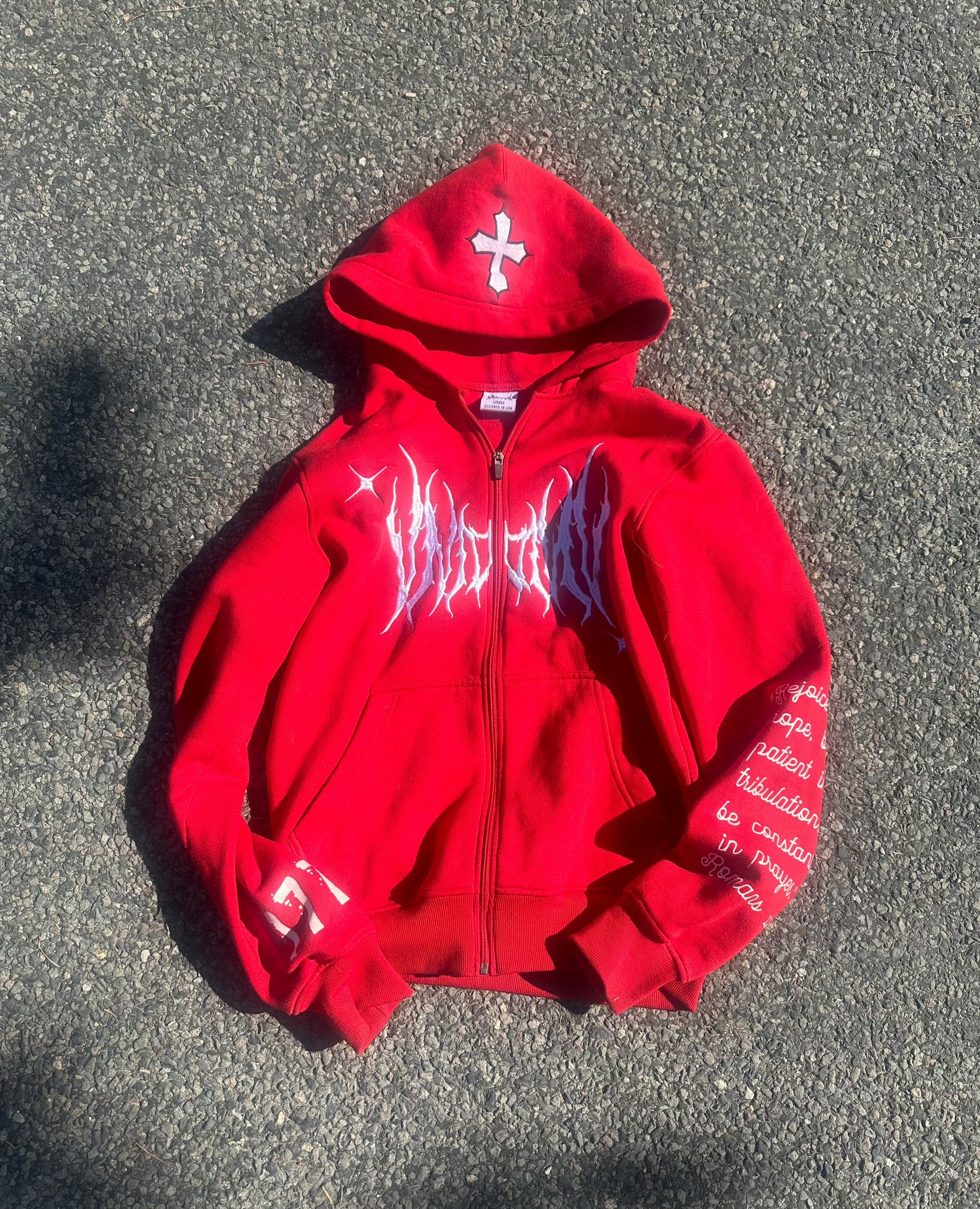 "Faith" Zip-Up Hoodie in striking red: Unleash your confidence in a sleek, versatile style.